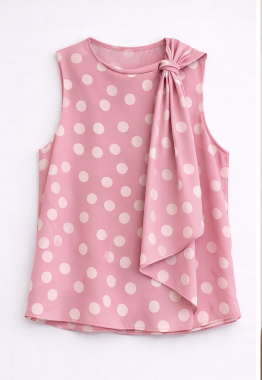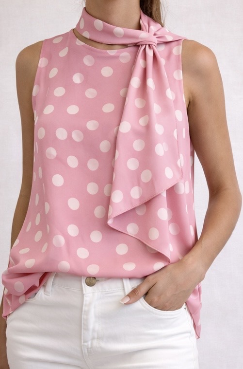 Blusa sin mangas en tejido ligero tipo gasa con estampado de lunares. Diseño con lazada al cuello que aporta un estilo femenino y delicado. Incluye forro interior para mayor comodidad y mejor caída. Perfecta para looks de verano y outfits más arreglados.