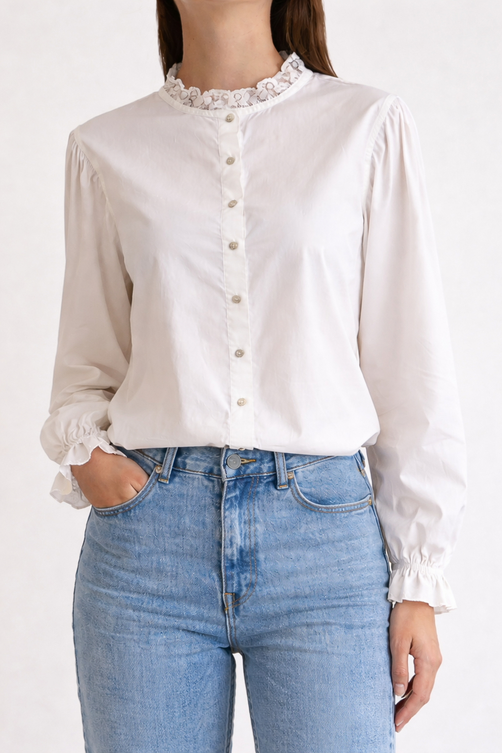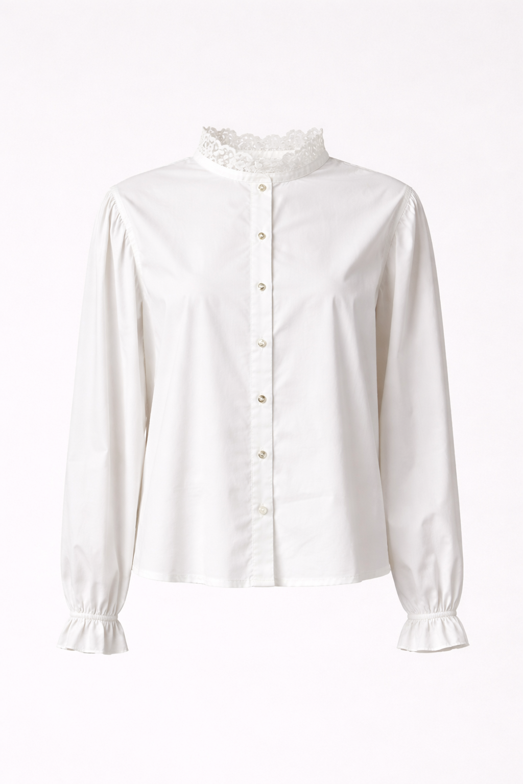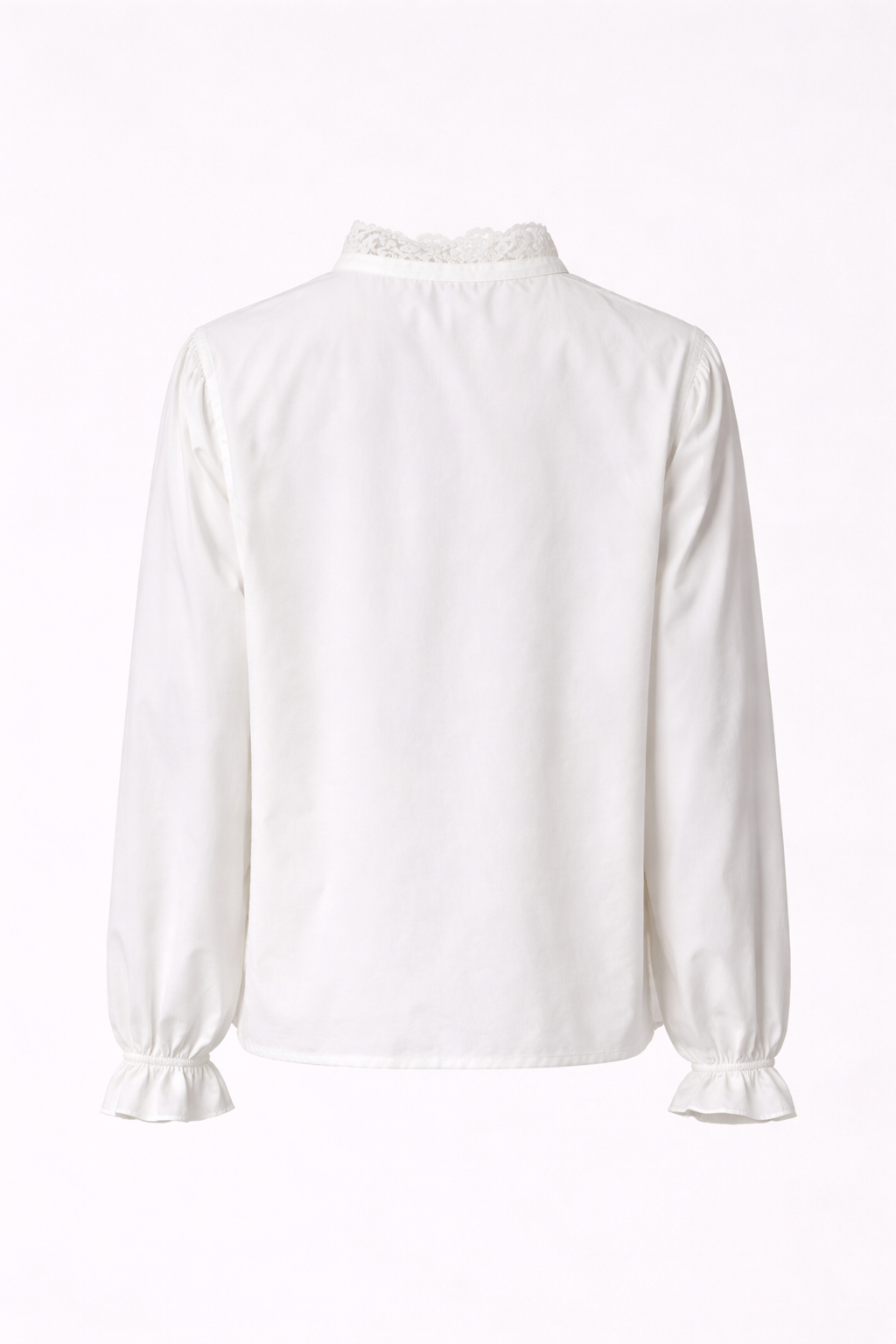 Blusa blanca confeccionada en algodón con ligero elastano, de tacto suave y cómodo. Destaca por su delicado cuello con bordado y acabado fruncido, manga ligeramente abullonada en el hombro y puño elástico. Diseño femenino y elegante, ideal para looks versátiles tanto de diario como más arreglados.