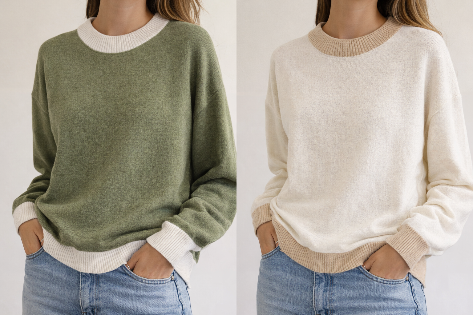 Jersey de punto en algodón 100%, con textura suave y corte cómodo. Diseño bicolor con contraste en cuello, puños y bajo que aporta estilo. Ideal para looks casuales con un toque actual y fácil de combinar.